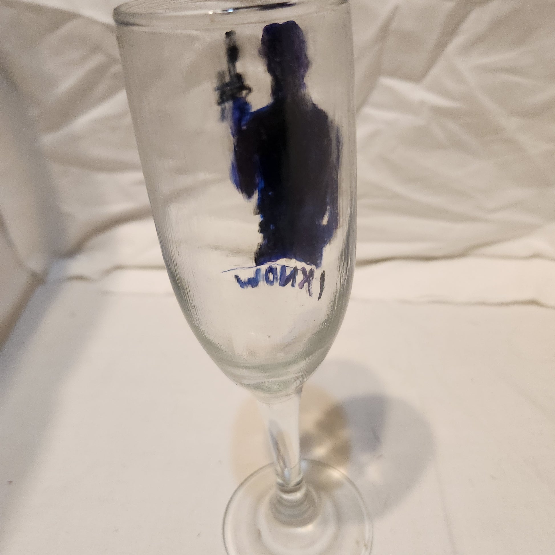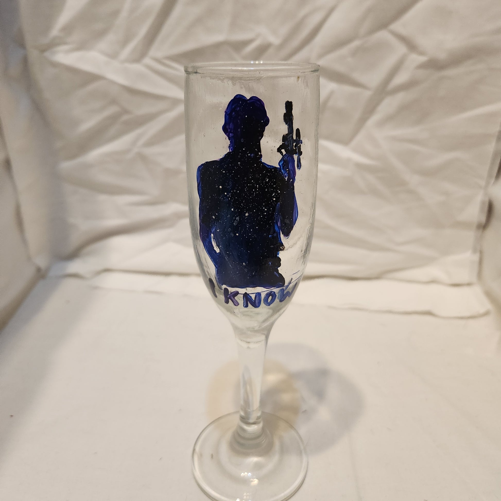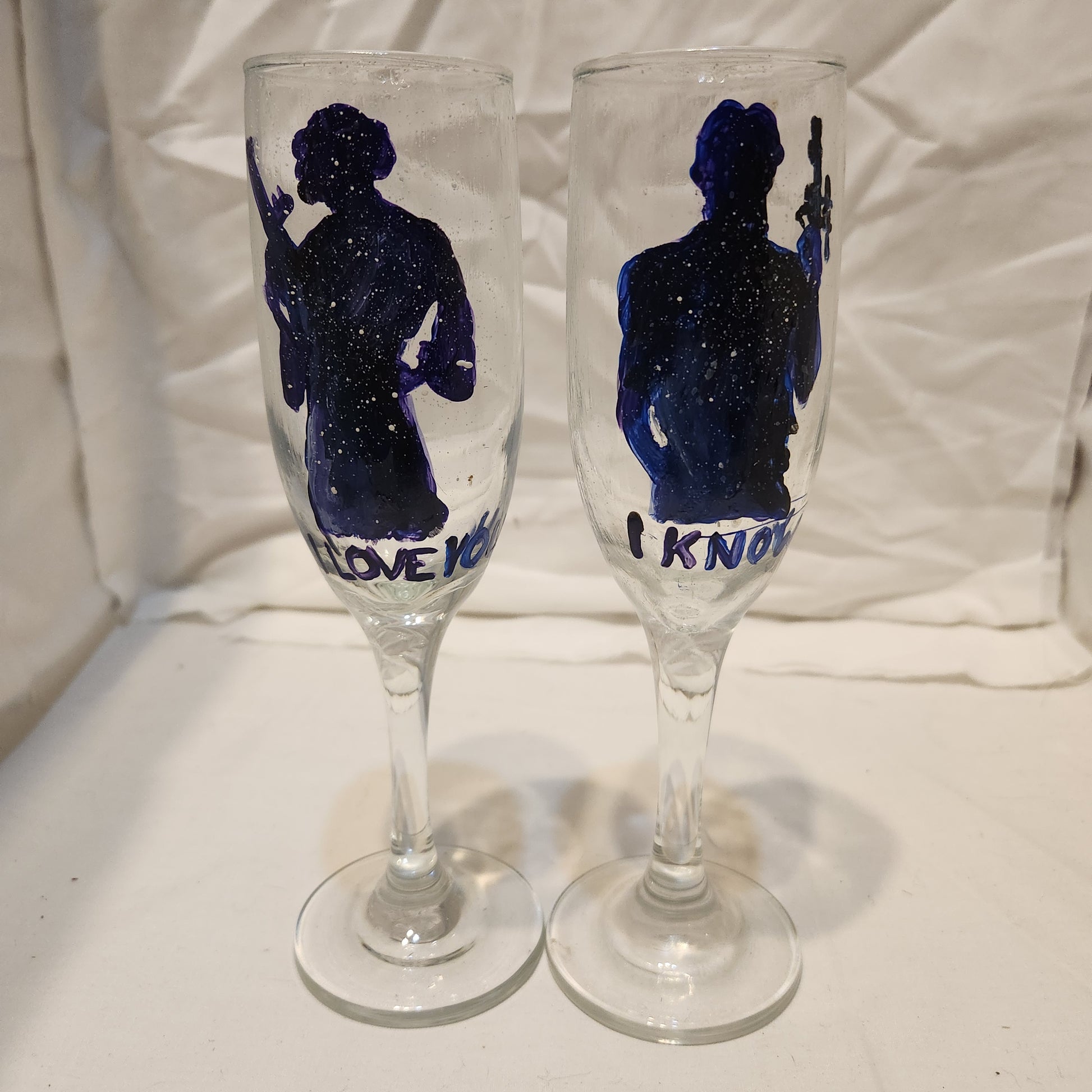 A wedding Dream for Star Wars fans. Hand Painted Wine glass set inspired by the characters of Han and Leia from Stars Wars. Wine glasses feature a galaxy inspired color combo. Images are visible on both inside and outside of glasses. Glasses are sealed with dishwasher safe modge podge, but we recommend hand washing only with a gentle soap.